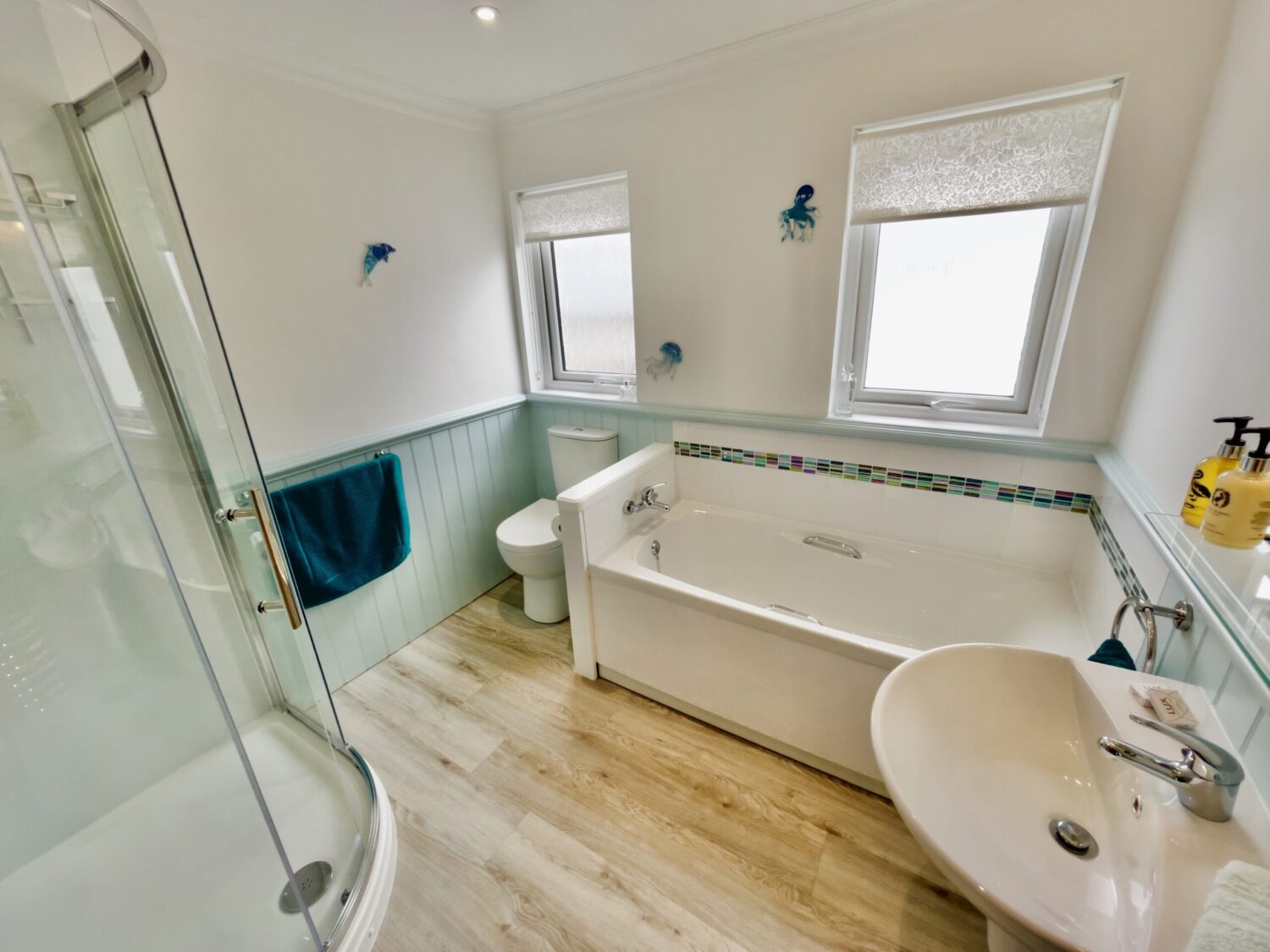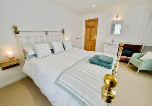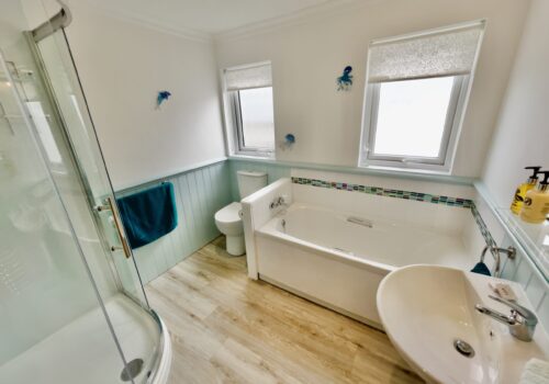 Upstairs, the master bedroom features a double bed, wall mounted TV and hand basin. A further double bedroom and a twin room are also located on this floor, along with a family bathroom complete with a bath and separate walk in shower.