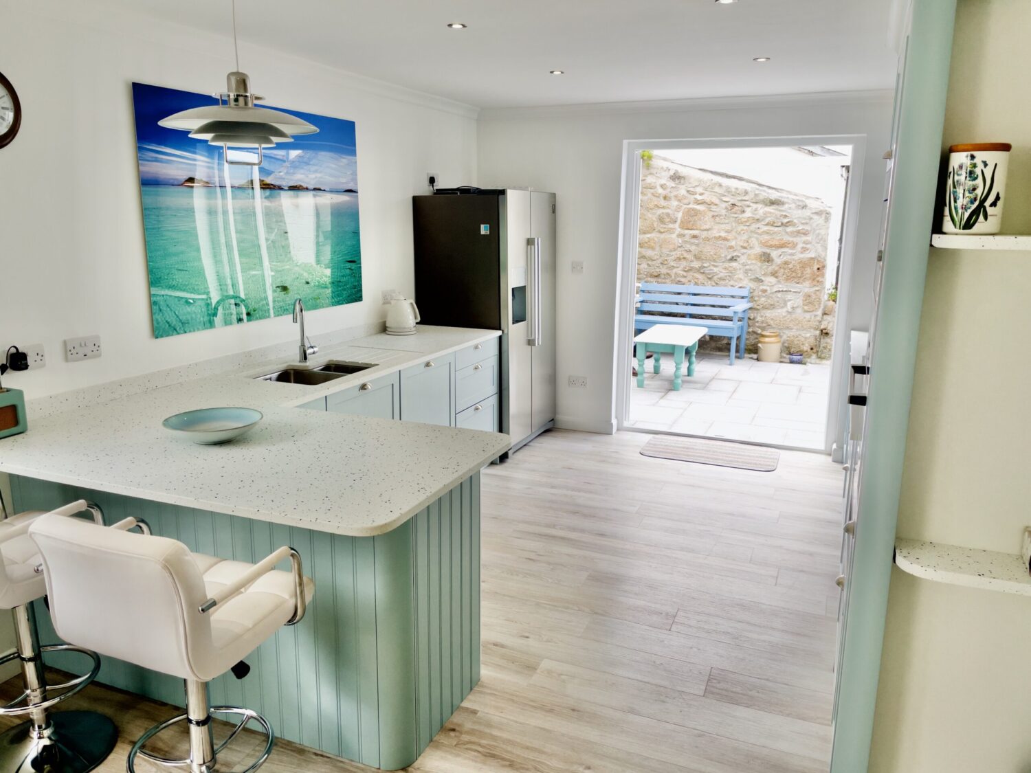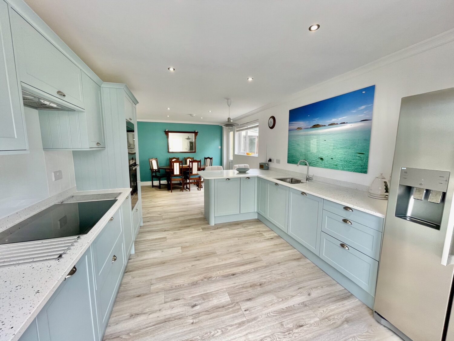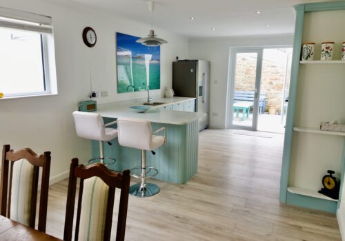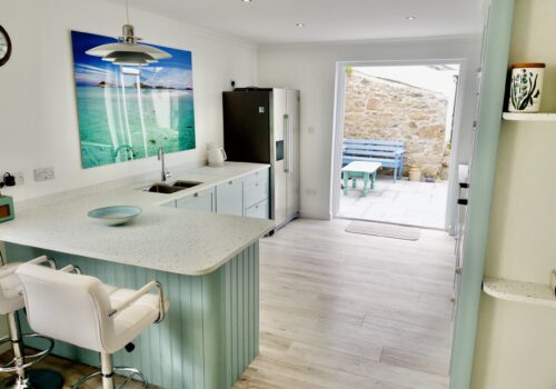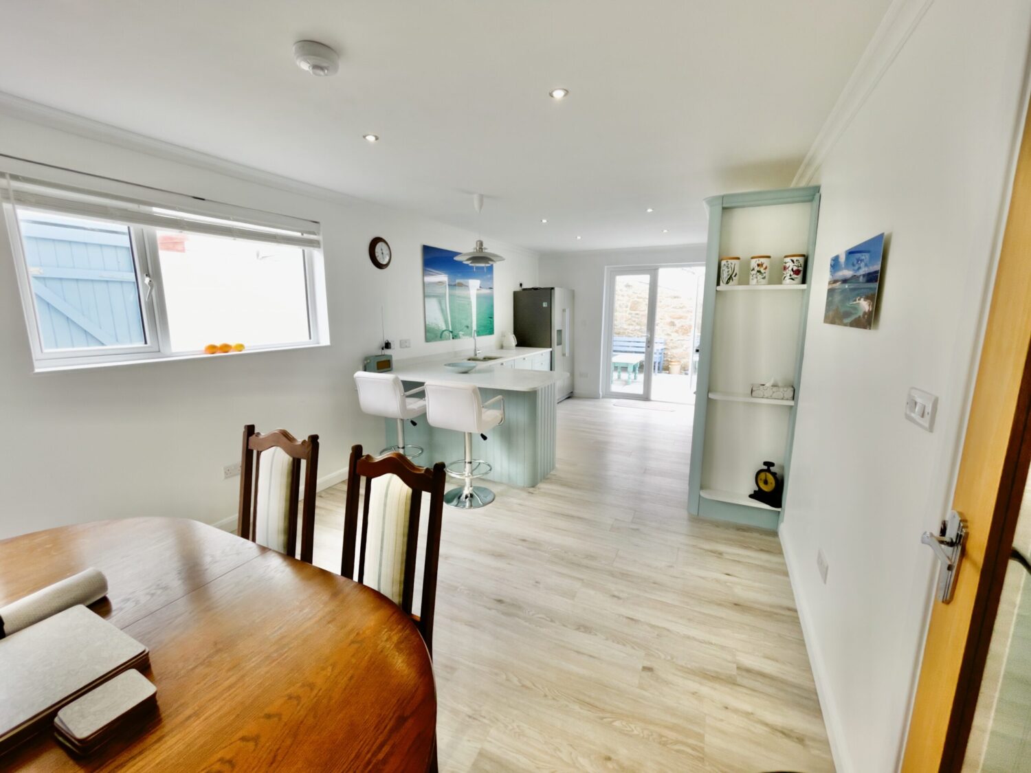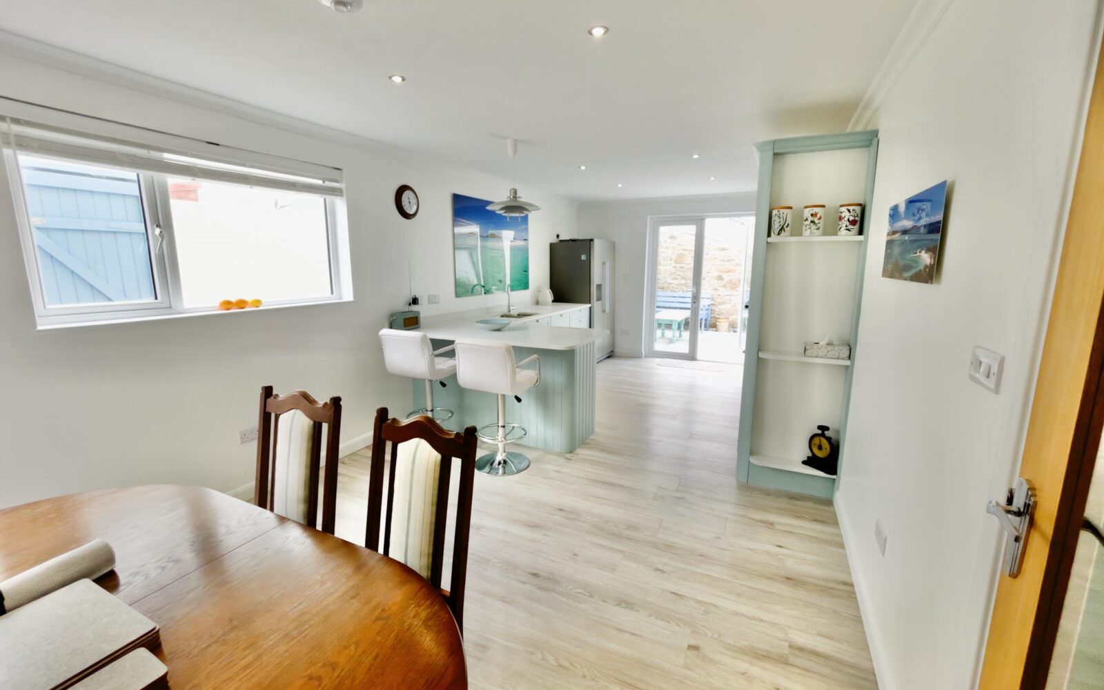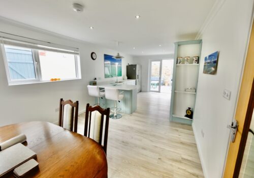 The front door opens into a welcoming hallway that leads through to a spacious open plan kitchen and dining area. This sociable space features a flexible dining table, breakfast bar seating and a well equipped kitchen with a large fridge freezer, electric oven, and a microwave. Please note that the electric hob is an induction hob, and therefore caution is required for those with pacemakers. Additional appliances include a washing machine and integrated dishwasher. The kitchen opens directly onto a private courtyard—ideal for rinsing sandy toes after a day on the beach or enjoying alfresco meals in the sunshine.