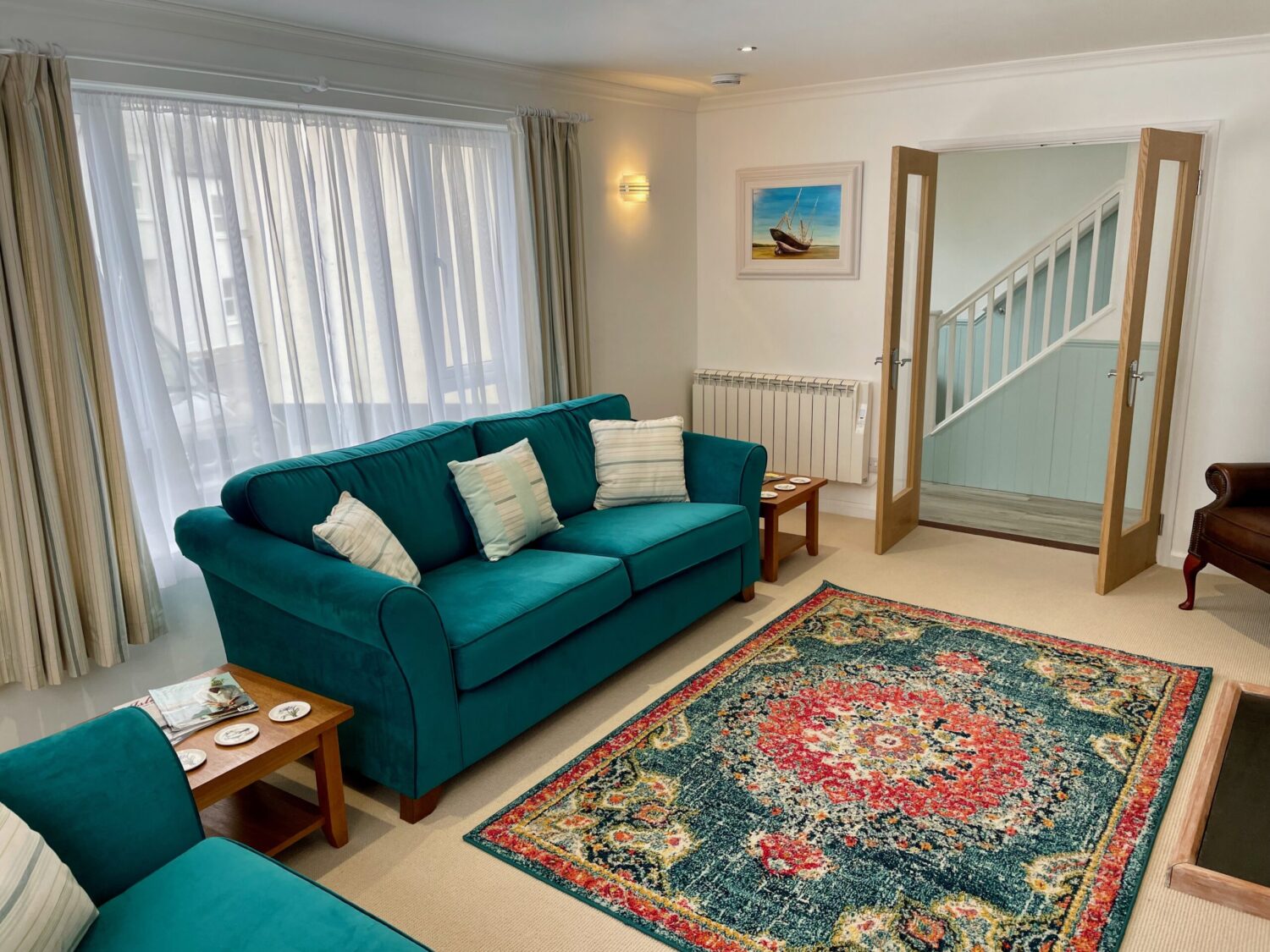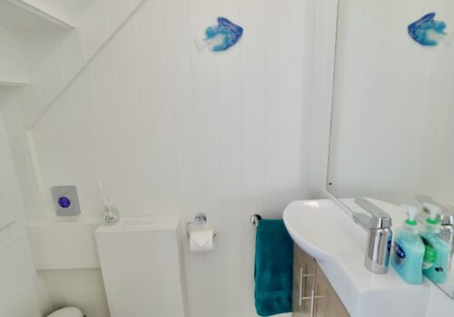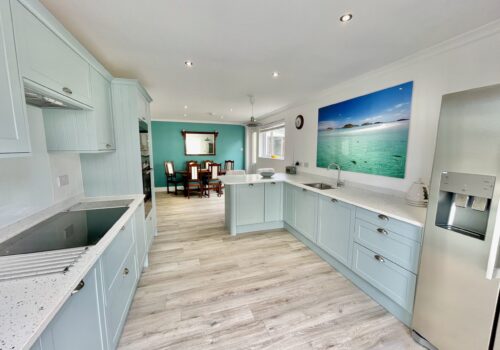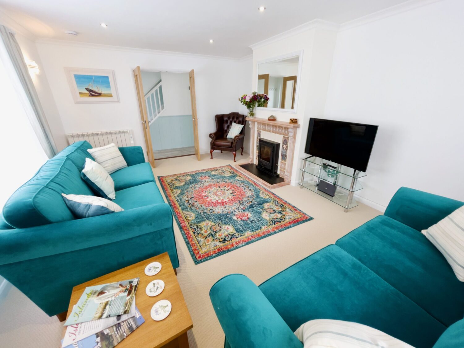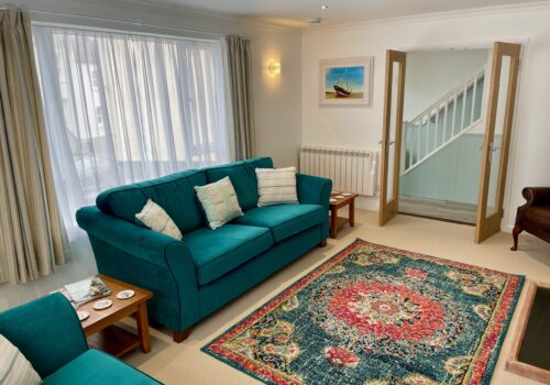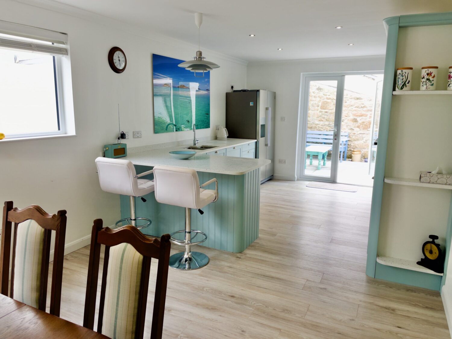The front door opens into a welcoming hallway that leads through to a spacious open plan kitchen and dining area. This sociable space features a flexible dining table, breakfast bar seating and a well equipped kitchen with a large fridge freezer, electric oven, and a microwave. Please note that the electric hob is an induction hob, and therefore caution is required for those with pacemakers. Additional appliances include a washing machine and integrated dishwasher. The kitchen opens directly onto a private courtyard—ideal for rinsing sandy toes after a day on the beach or enjoying alfresco meals in the sunshine.
