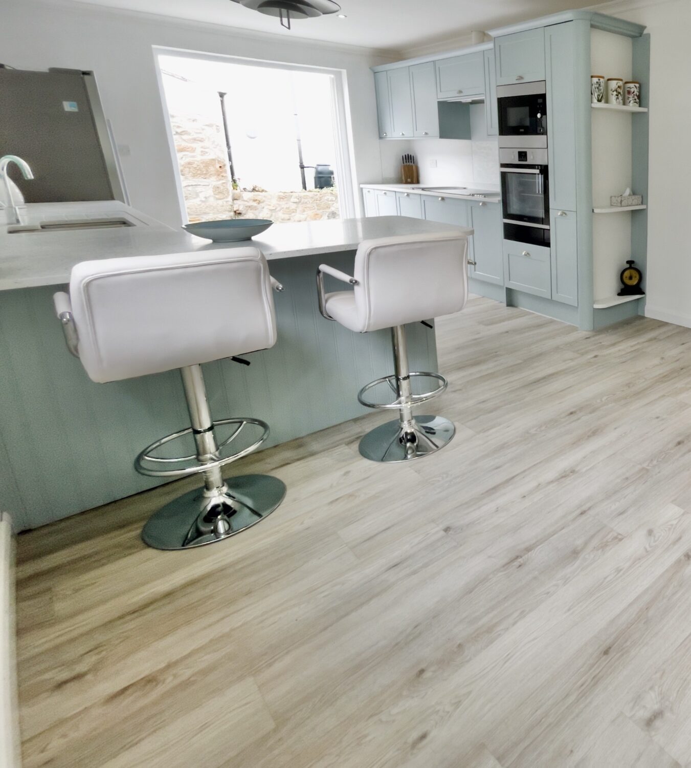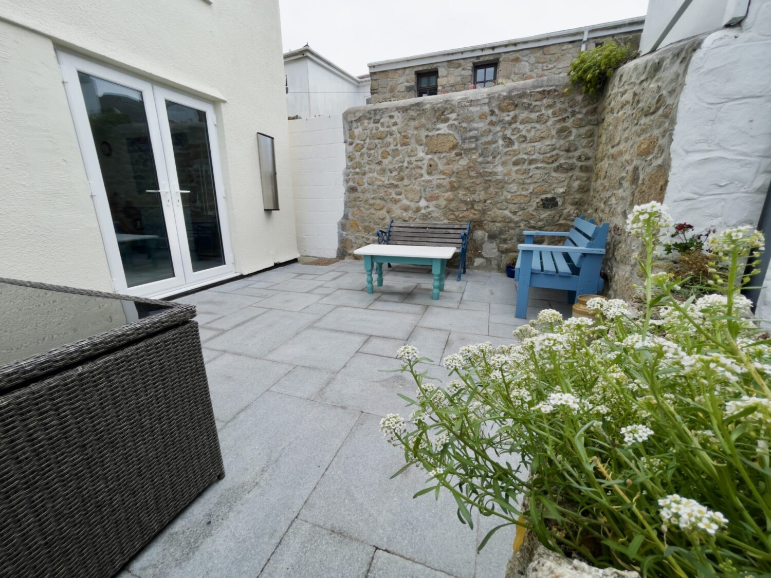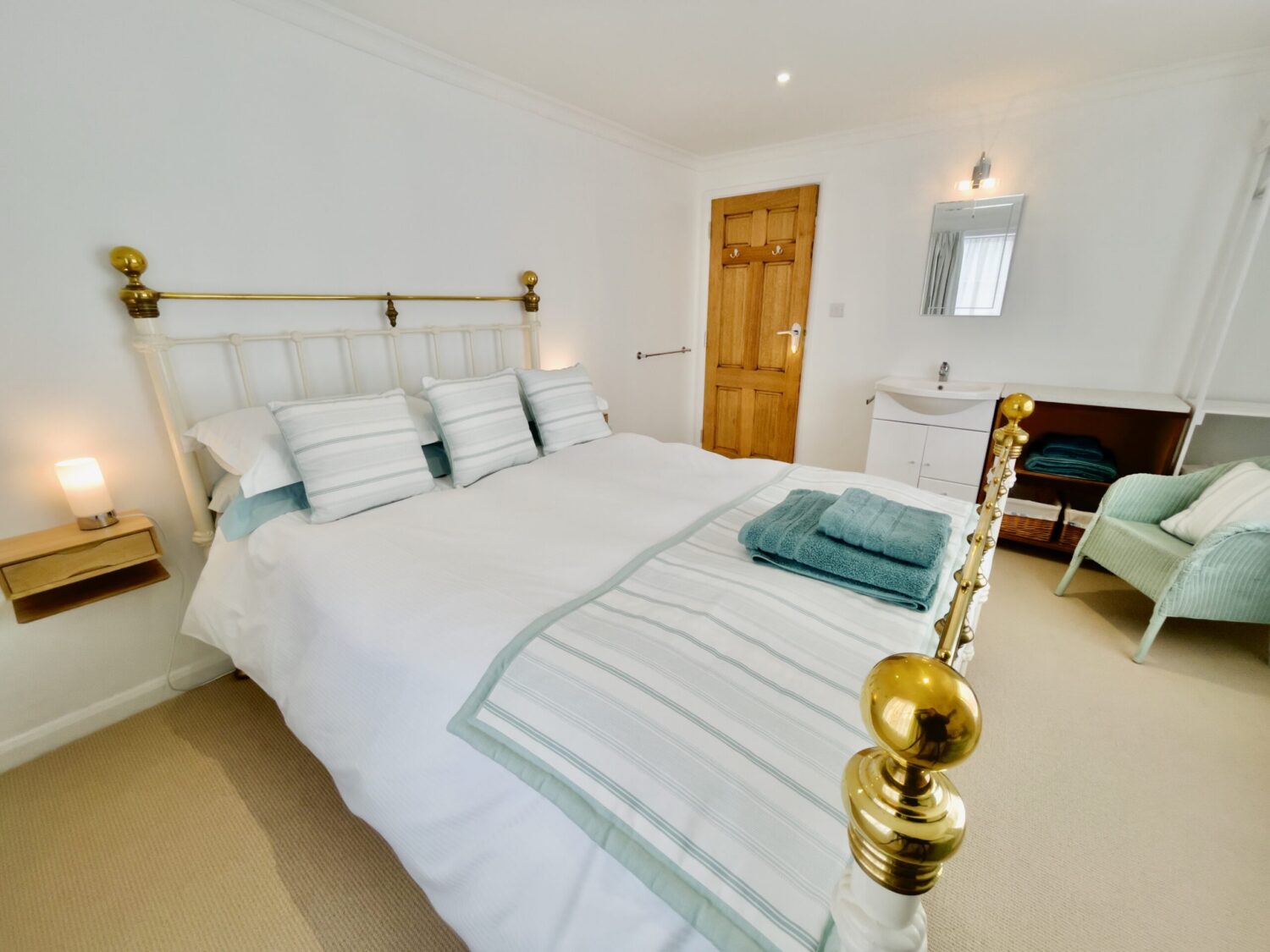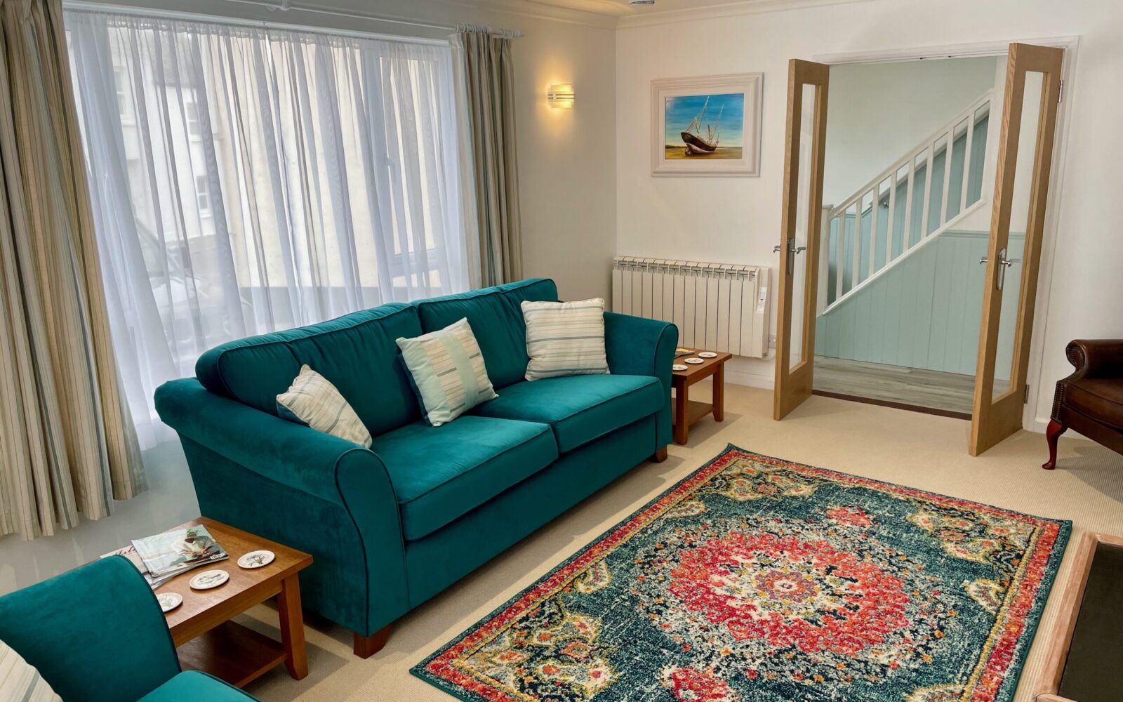 The front door opens into a welcoming hallway that leads through to a spacious open plan kitchen and dining area. This sociable space features a flexible dining table, breakfast bar seating and a well equipped kitchen with a large fridge freezer, electric oven, and a microwave. Please note that the electric hob is an induction hob, and therefore caution is required for those with pacemakers. Additional appliances include a washing machine and integrated dishwasher. The kitchen opens directly onto a private courtyard—ideal for rinsing sandy toes after a day on the beach or enjoying alfresco meals in the sunshine.